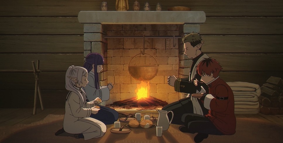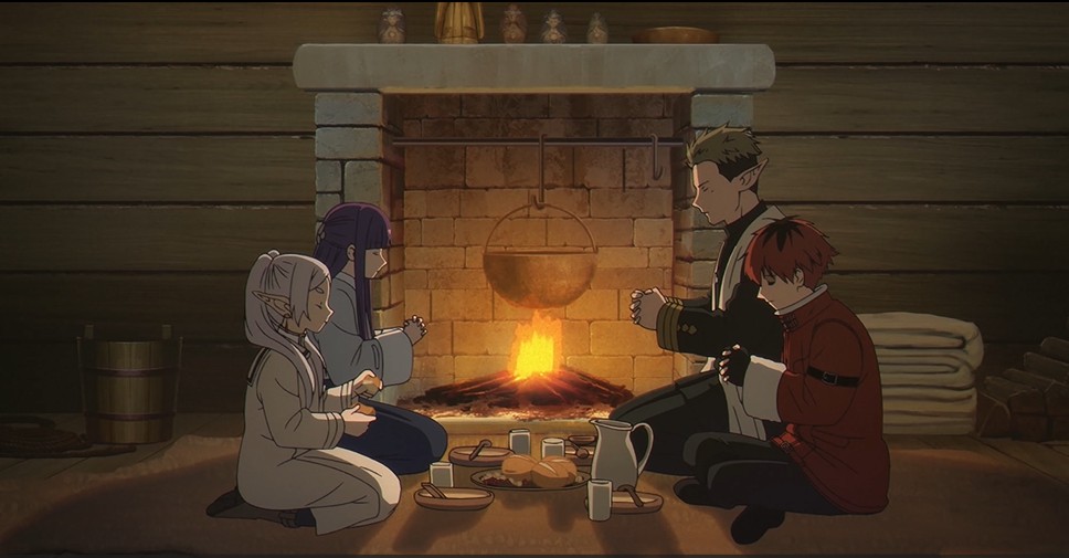 24 | 11 |  |   | 食前にクラフトが祈りを捧げるカットで、原作通りのクラフトとフェルンの2人が祈りを捧げているカットの後で、細かい冬ごもりイベントの数カットを経てシュタルクも祈りを捧げているカットが追加され、半年の時間経過とシュタルクの変化を表現しています。キャラの内面の独自解釈に踏み込んでいますが、シュタルクは信仰よりフェルンに合わせているだけという解釈も可能か。フリーレンは変化なしですが、アニメのほうが原作よりお行儀がいいです(パンをちぎって食べてる)。 シュタルクとフリーレンの座っている位置が変わっている意図は不明。 スープ皿のようなので、アニメで料理鍋が暖炉に吊り下げられているというのは妥当な描写 |