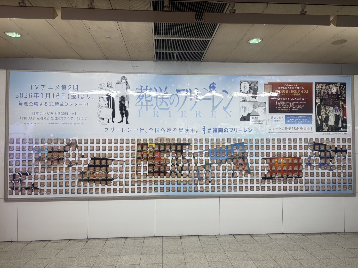 公式で告知されましたが、12/22の朝に、全国の駅で「葬送のフリーレン」のアニメ2期合わせの「ピールオフ広告」が展開されました。公式Xによれば、以下の7つの場所で1枚剥がして持っていける形で配布されたようです。
