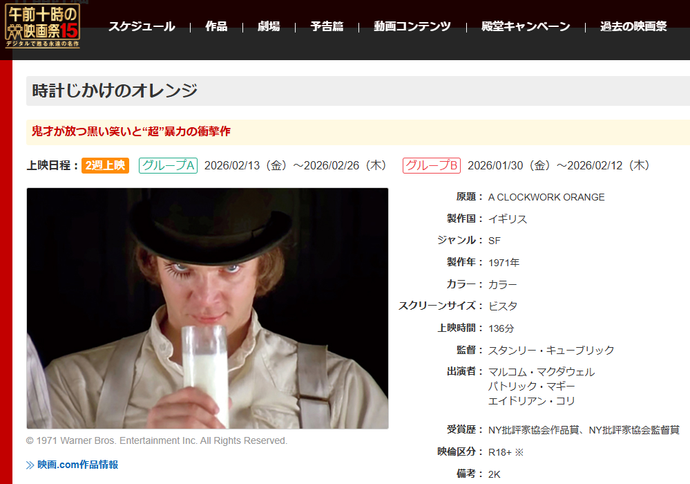 「2001年宇宙の旅」については明確に「これは自宅の小さいモニタで観るよりは大スクリーンで4K版を観るべき映画ですので」と言える作品なのですが、しょうじき「時計じかけのオレンジ」については、大スクリーンで観るべきというほどの映像や音響ではなく、配信を自宅PCで観てもぜんぜん構わないと思ってます。