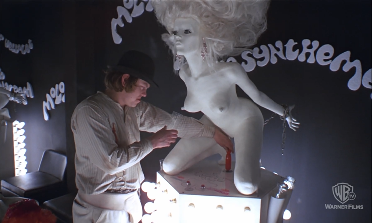 確かこれ「映画宝庫」のSF映画特集号だったと思うんだけど(発掘されたら晒します)、「時計じかけのオレンジ」を他のSF映画と一緒に紹介したページで、一緒に使っていた小さな白黒写真がこのカットからでした。